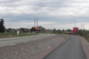 Vy österut från byggområdets norra sida. När den nya GC-vägen har gått under Bärbyleden på väg mot Nyby kommer den nästan upp i markplanet för att sedan gå ner igen under Råbyvägen. (Bild-ID: 55-0129) |